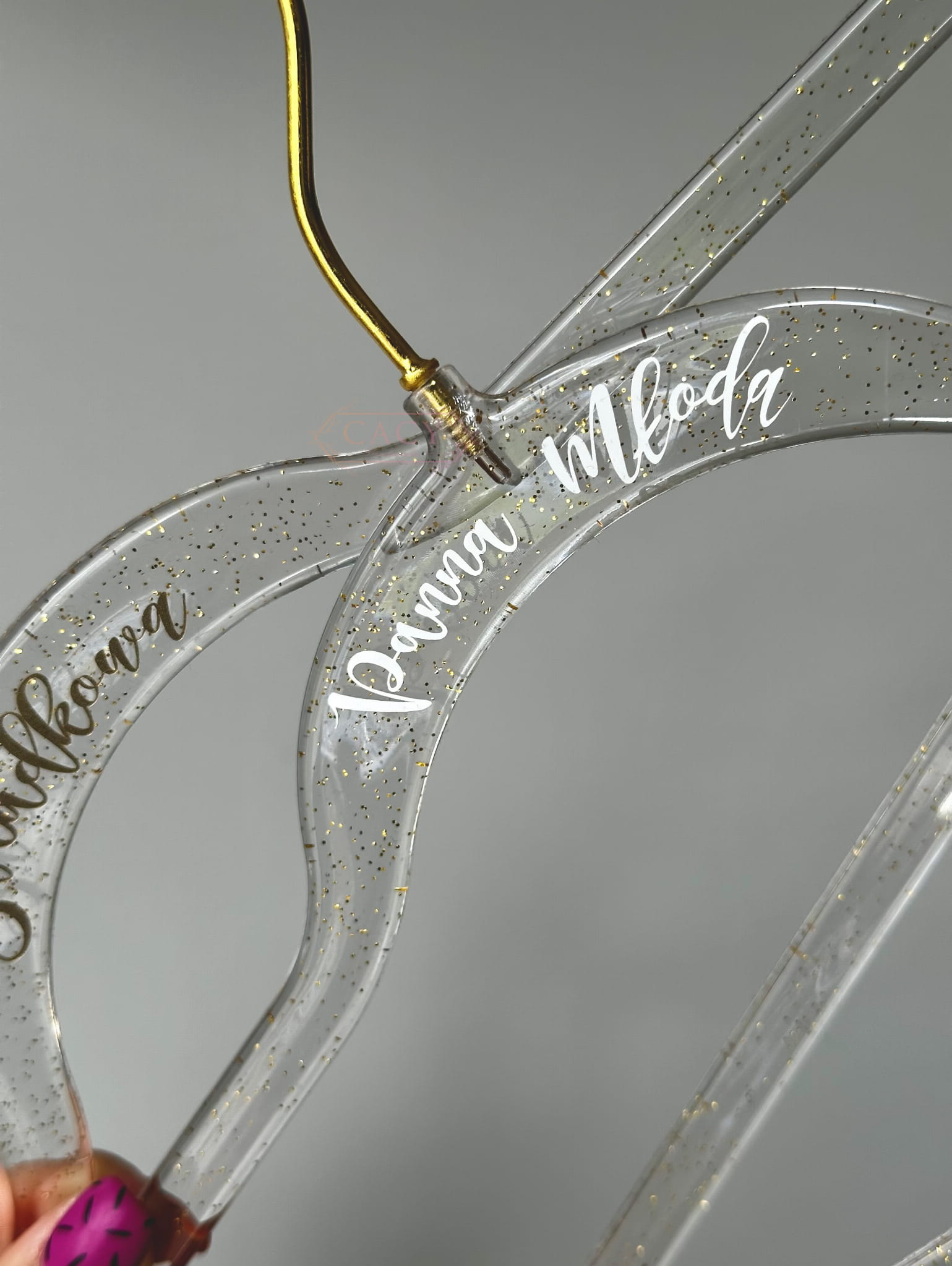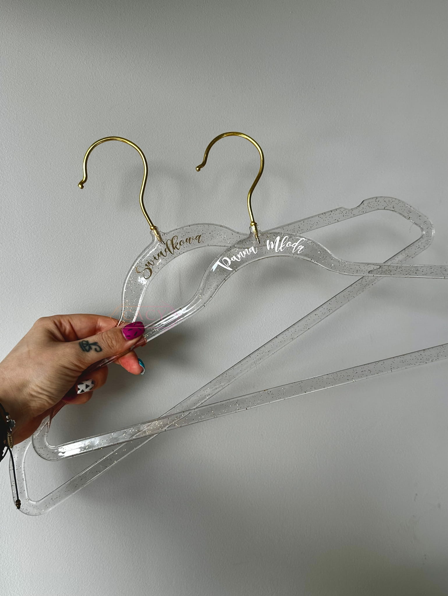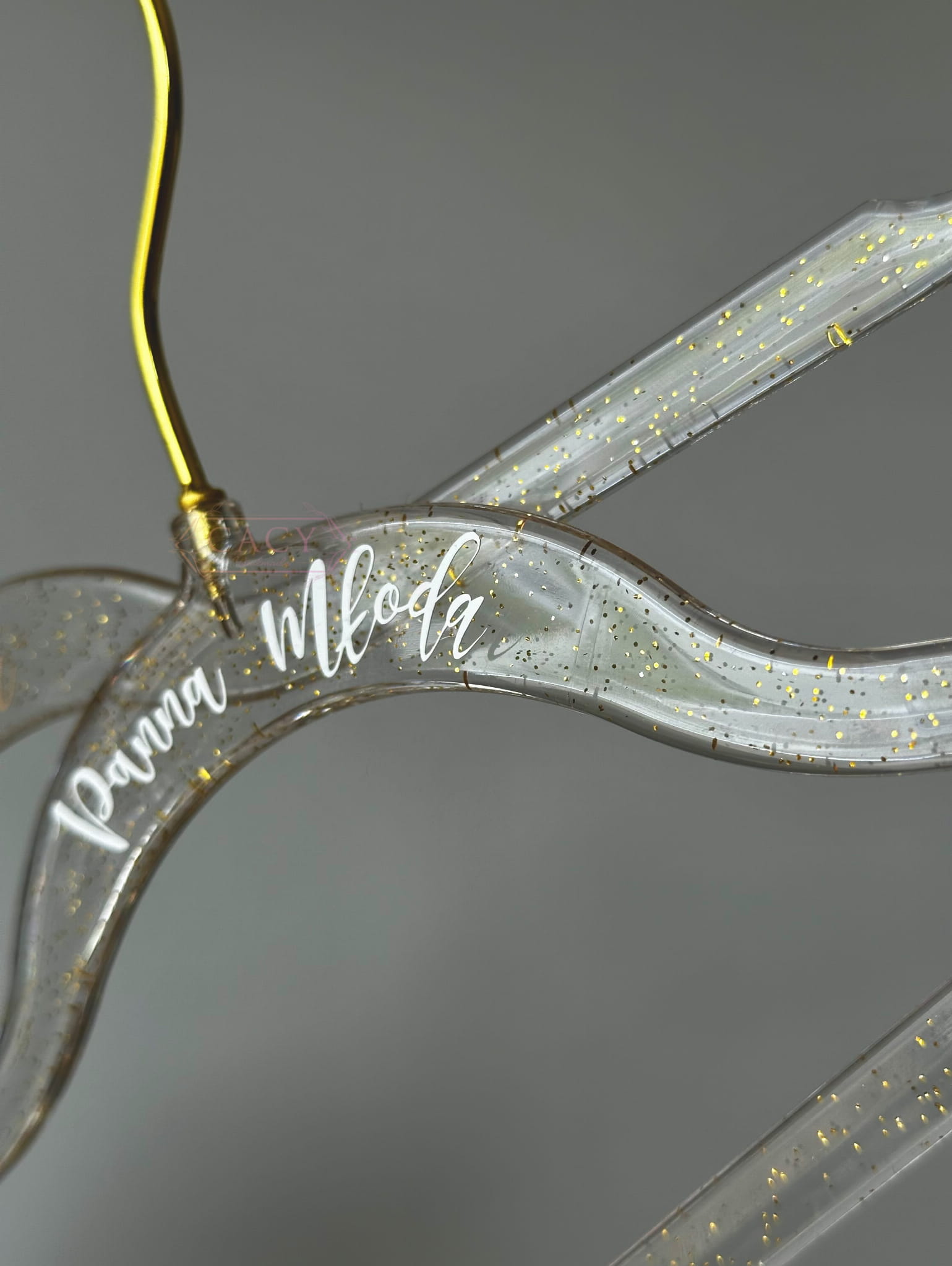personalizowane, akrylowe wieszaki ze złotymi drobinkami zatopionymi wewnątrz to idealny dodatek podczas przygotowań przedślubnych, zarówno dla Panny Młodej, jak i świadkowej, druhen... całego BRIDE SQUAD!