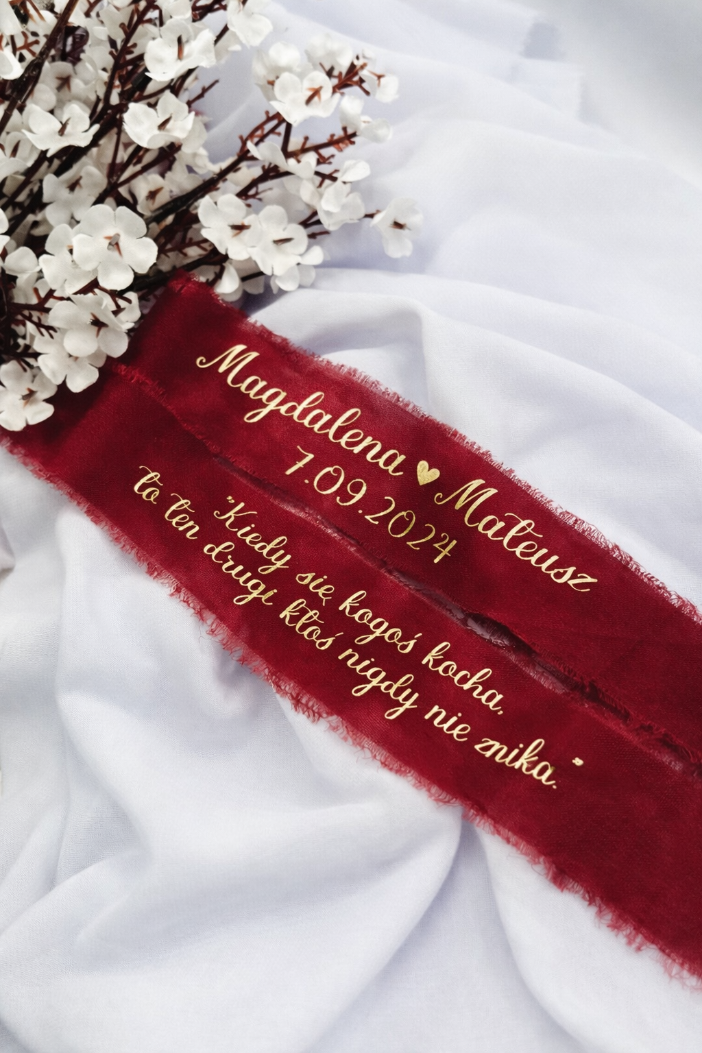 personalizowana wstążka do Twojego bukietu ślubnego, która idealnie sprawdzi się nie tylko do makro ujęć fotograficznych, ale również w późniejszym czasie, stanowić będzie wyjątkową pamiątkę z tego dnia.