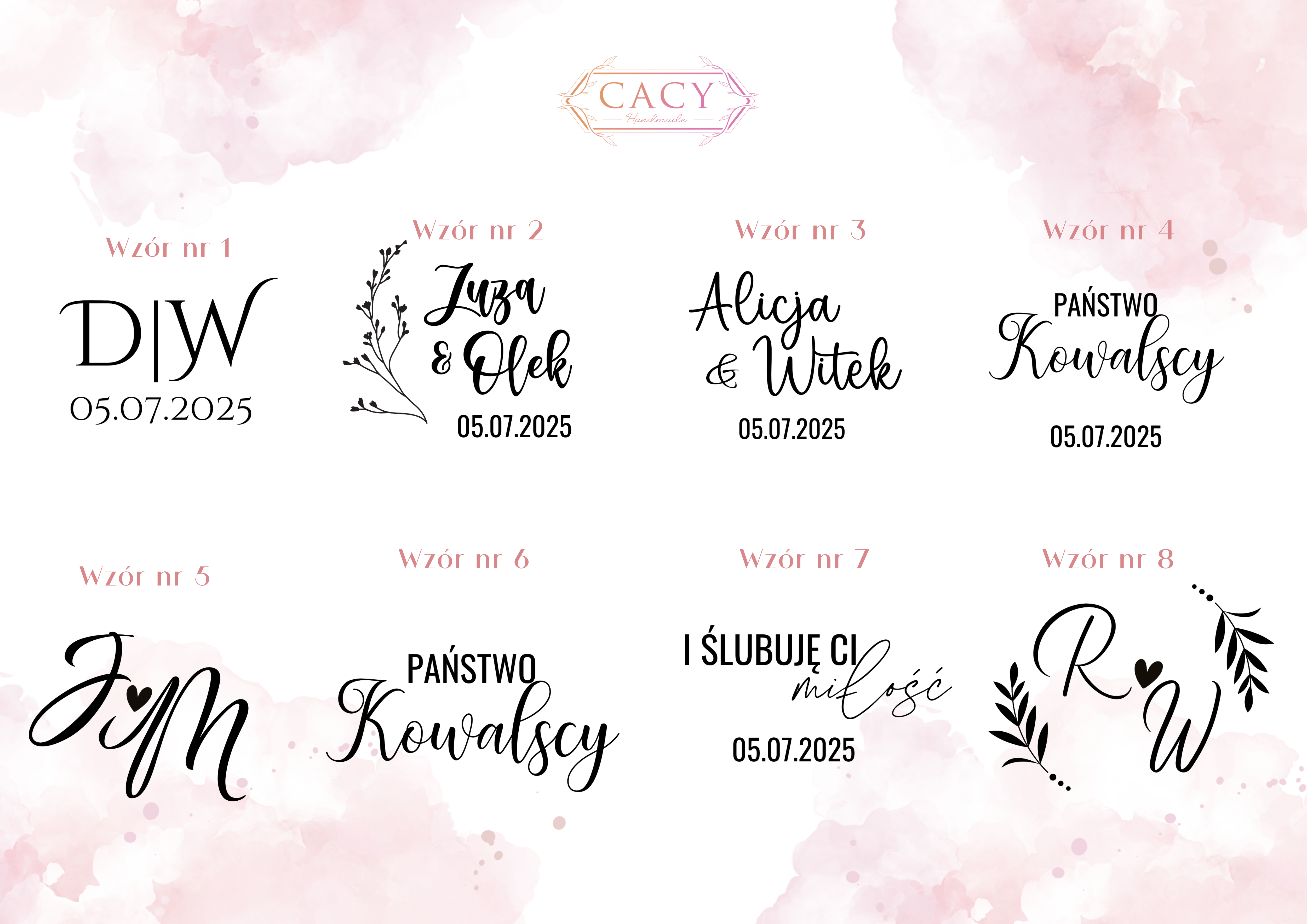 ważne! na pudełku zostaną umieszczone wyłącznie informacje zgodne z wybranym wzorem, tj. jeśli wybierzecie wzór nr 7 i podacie inicjały i datę- na personalizacji, zgodnie ze wzorem znajdzie się wyłącznie data ślubu. itp.