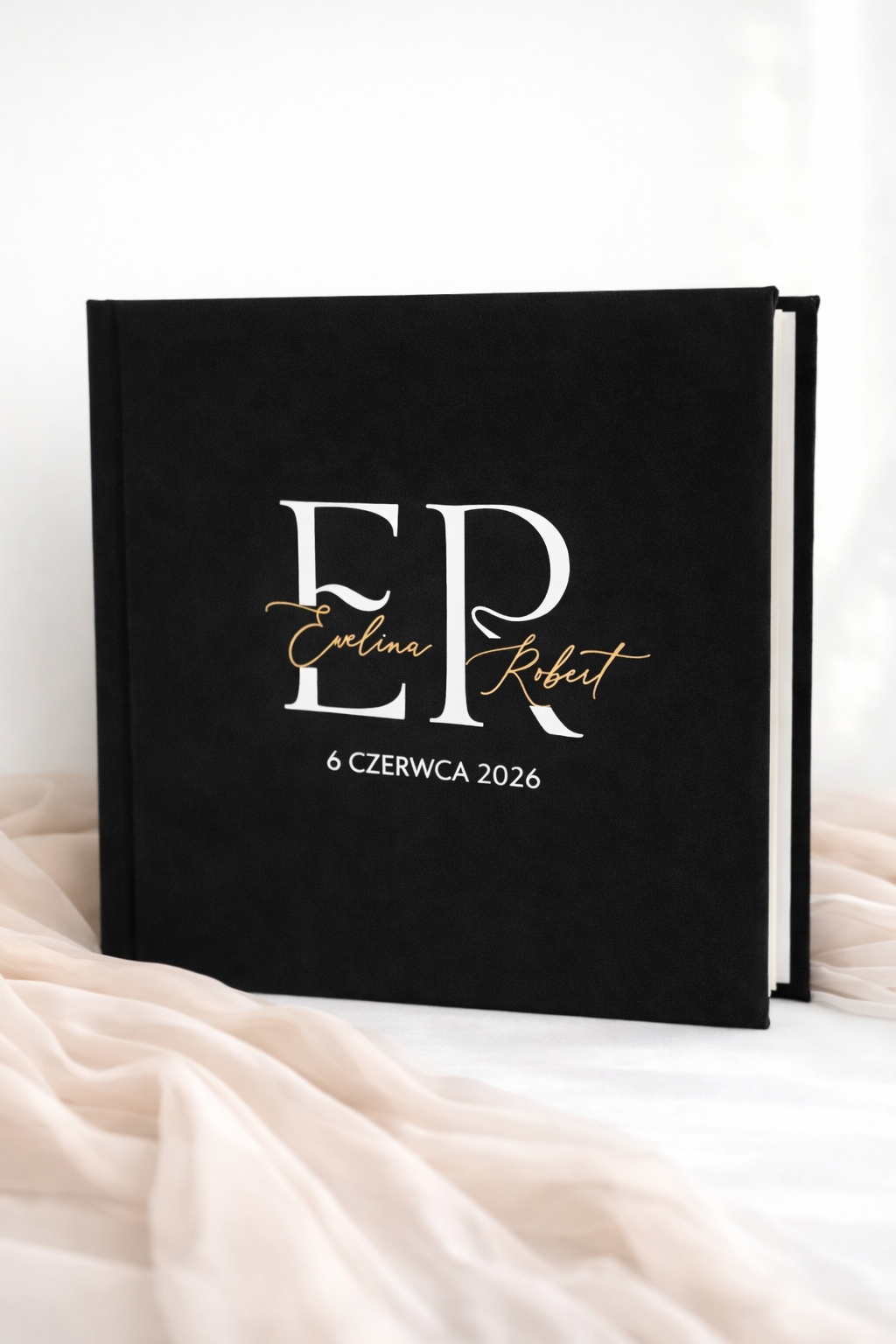 miękka, welurowa okładka jest przyjemna w dotyku i pięknie prezentuje się zarówno w dniu ślubu, jak i później — jako element domowej kolekcji najważniejszych chwil. w środku znajdują się gładkie, czyste karty, idealne na życzenia od gości, osobiste wpisy oraz wklejanie zdjęć.
