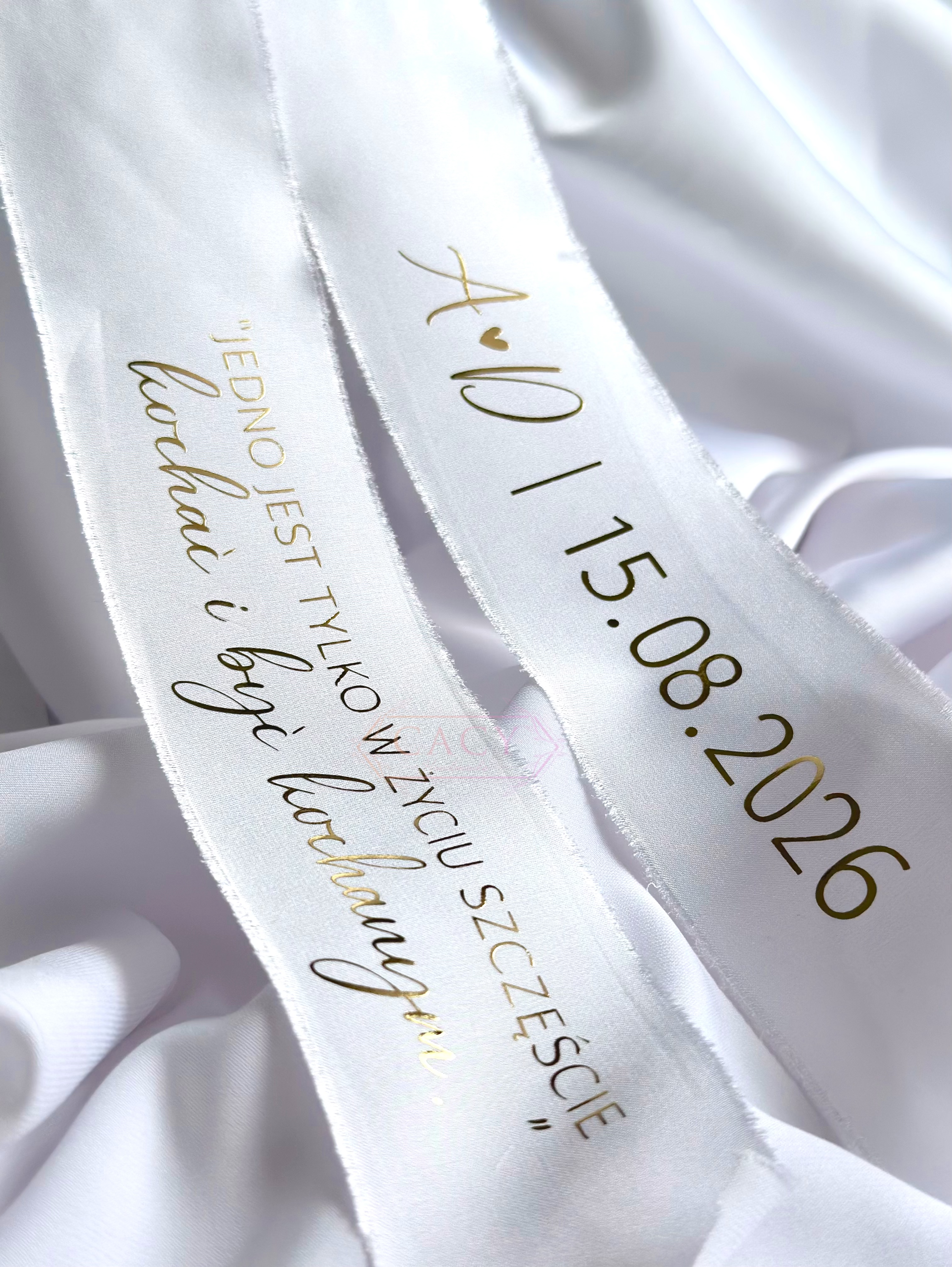 cena dotyczy jednej sztuki wstążki w wybranym kolorze i dowolną personalizacją o długości 150 cm idealnej do obwiązania bukietu ślubnego i ewentualnego uformowania kokardy :)