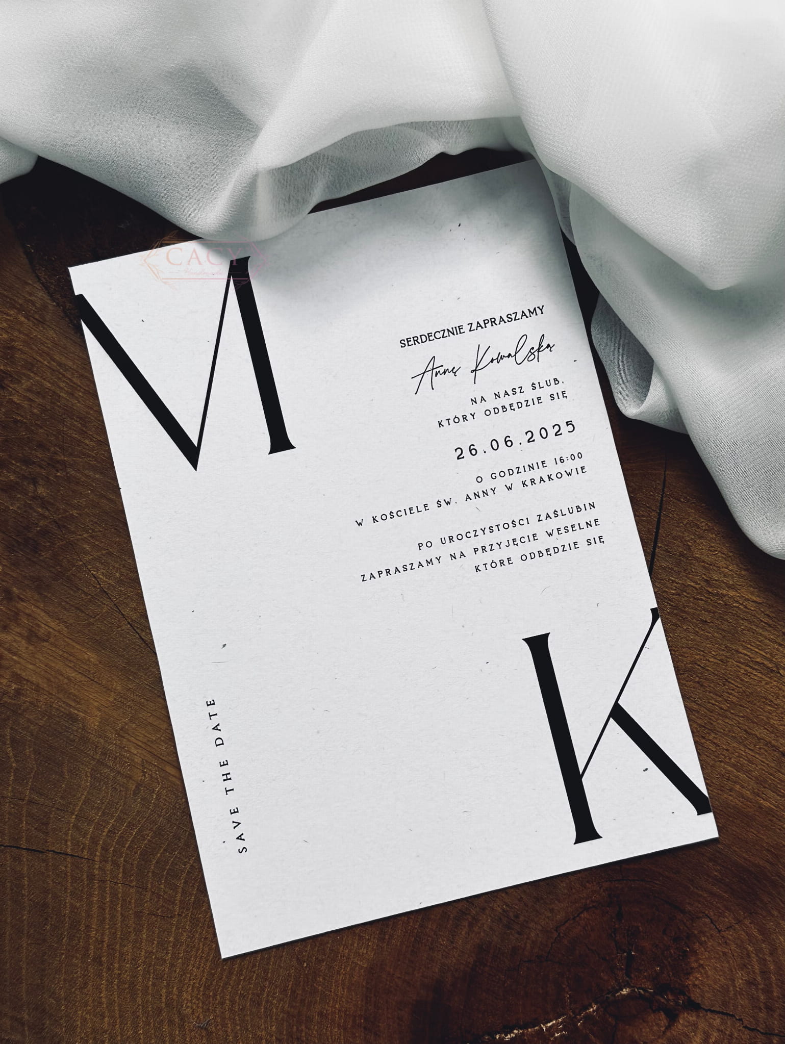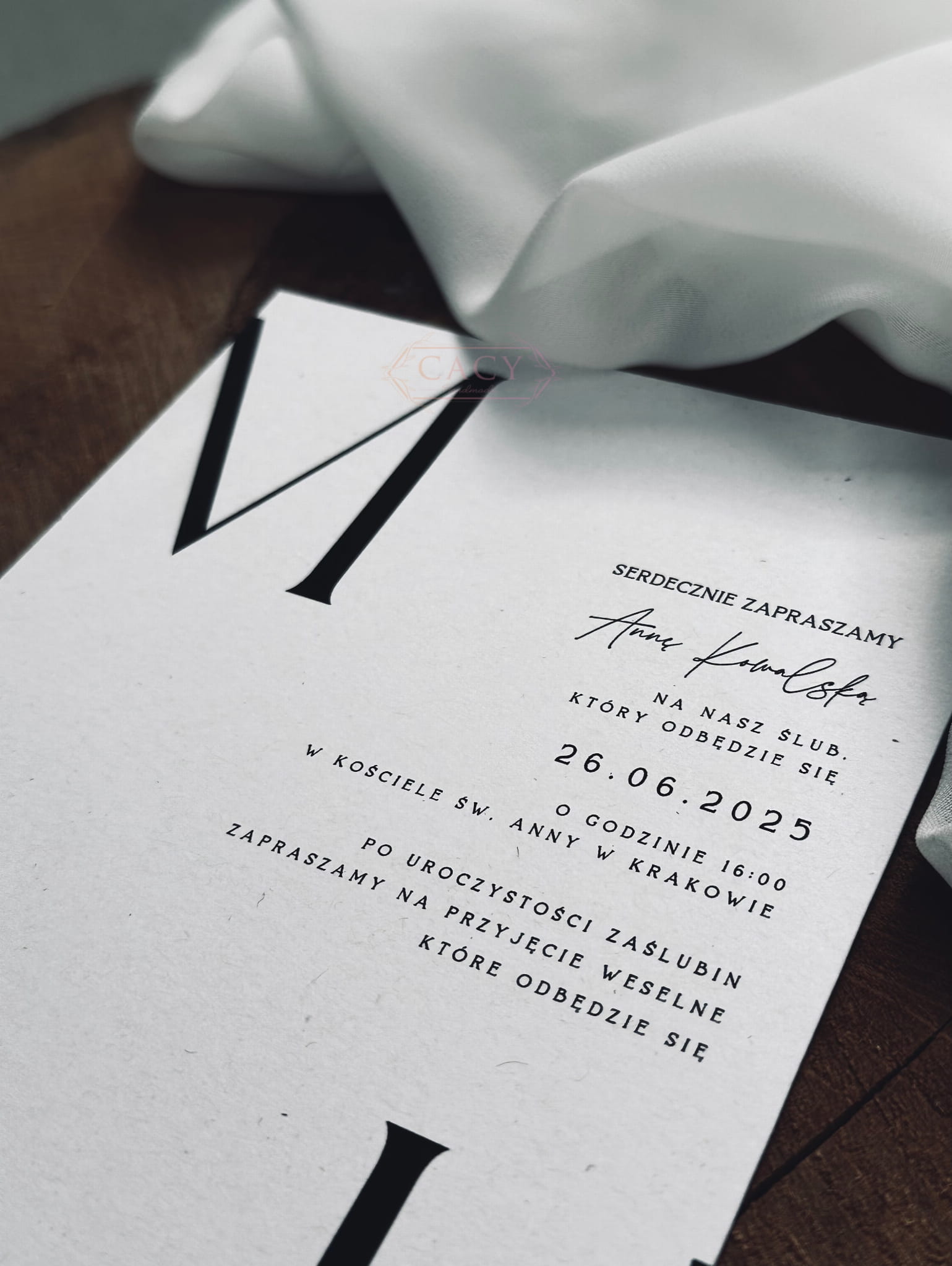 Zaproszenie drukowane jest na wybranym papierze, co pozwala dopasować jego charakter do preferencji Pary Młodej. Każdy egzemplarz przygotowywany jest na zamówienie i podlega pełnej personalizacji treści oraz inicjałów.