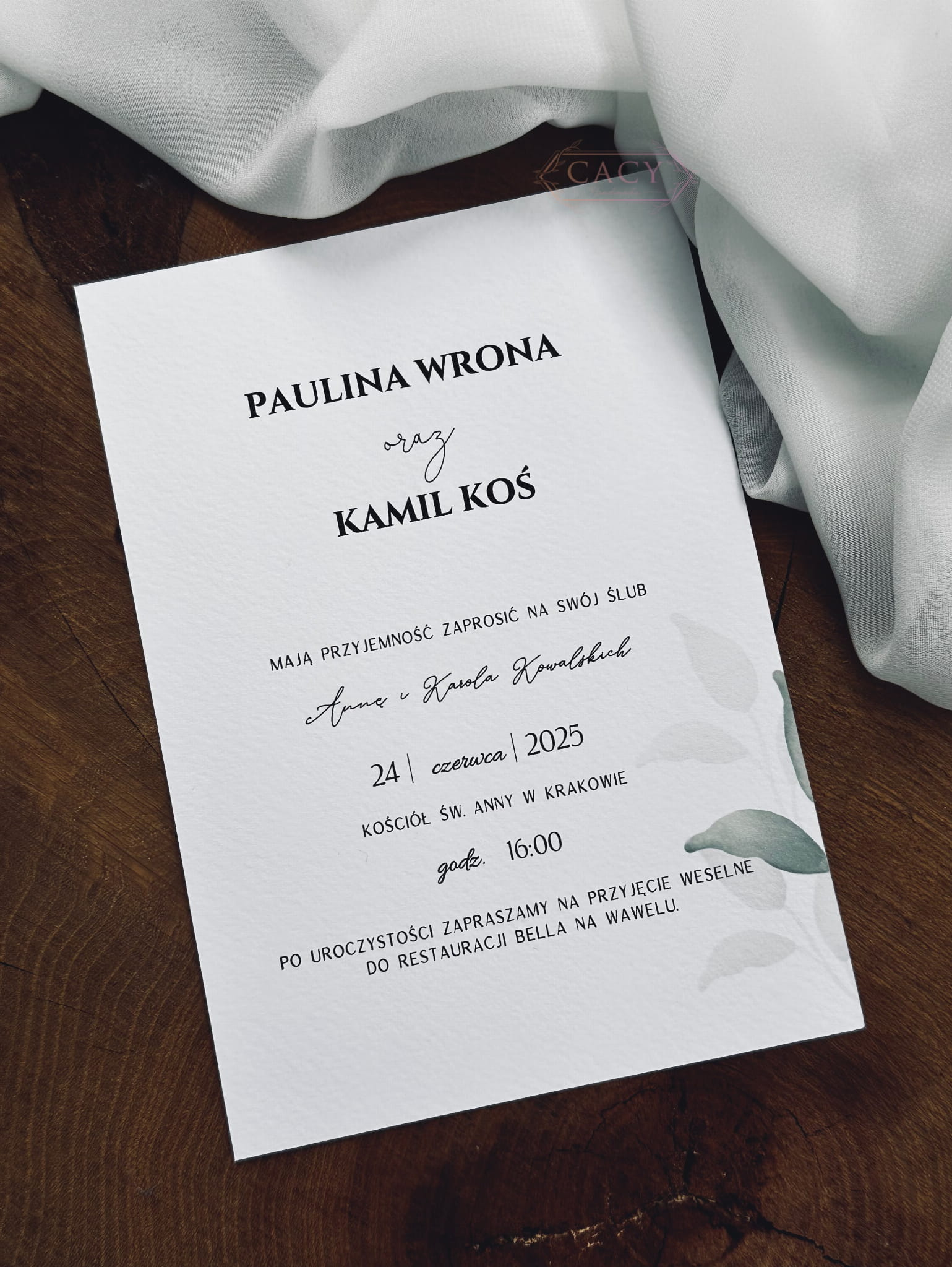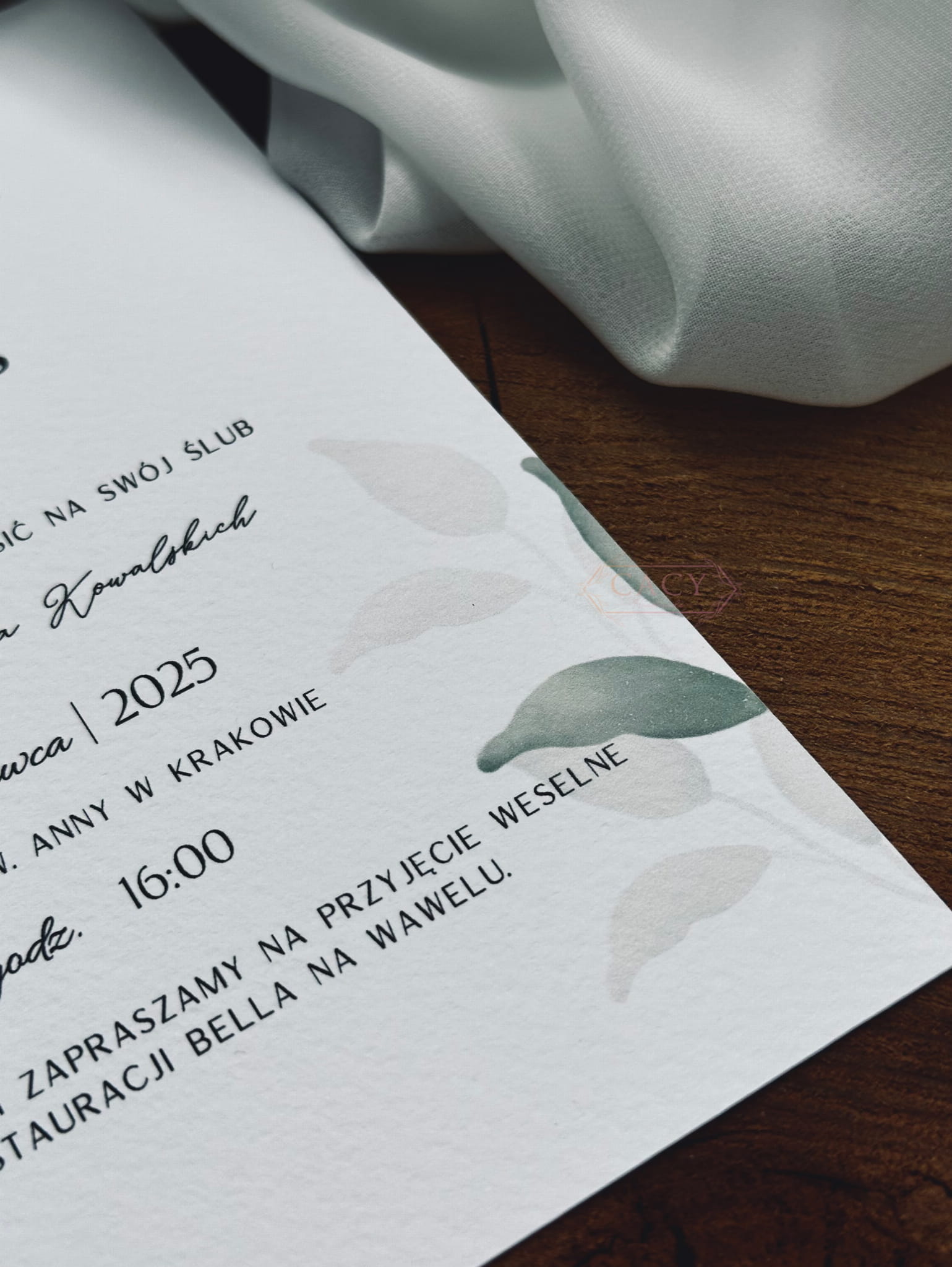 Zaproszenie może zostać wykonane na papierze do wyboru, co pozwala dopasować jego wygląd do charakteru wesela i pozostałej papeterii. Subtelna kolorystyka oraz naturalny motyw roślinny sprawiają, że zaproszenie prezentuje się lekko, świeżo i bardzo stylowo.