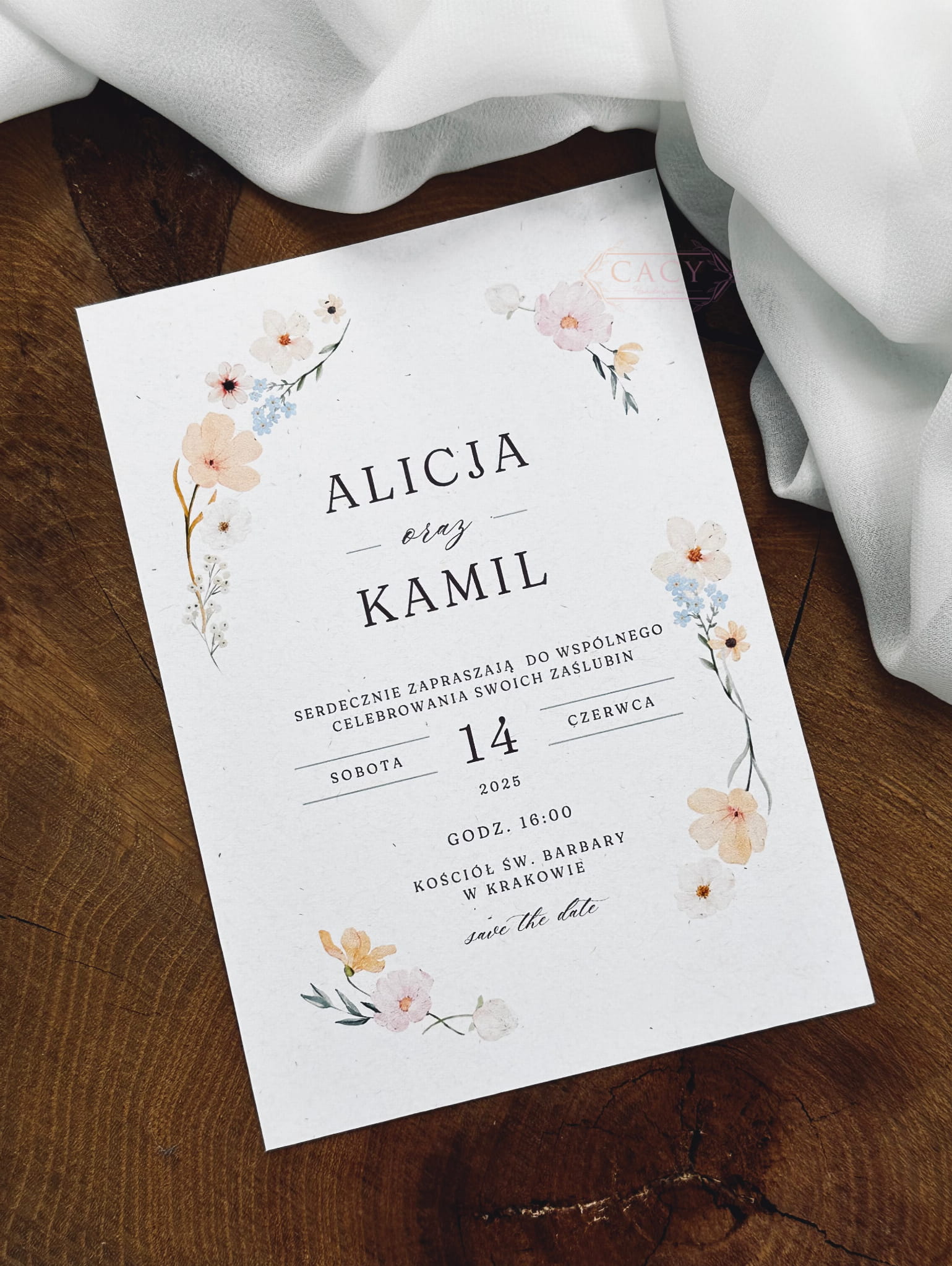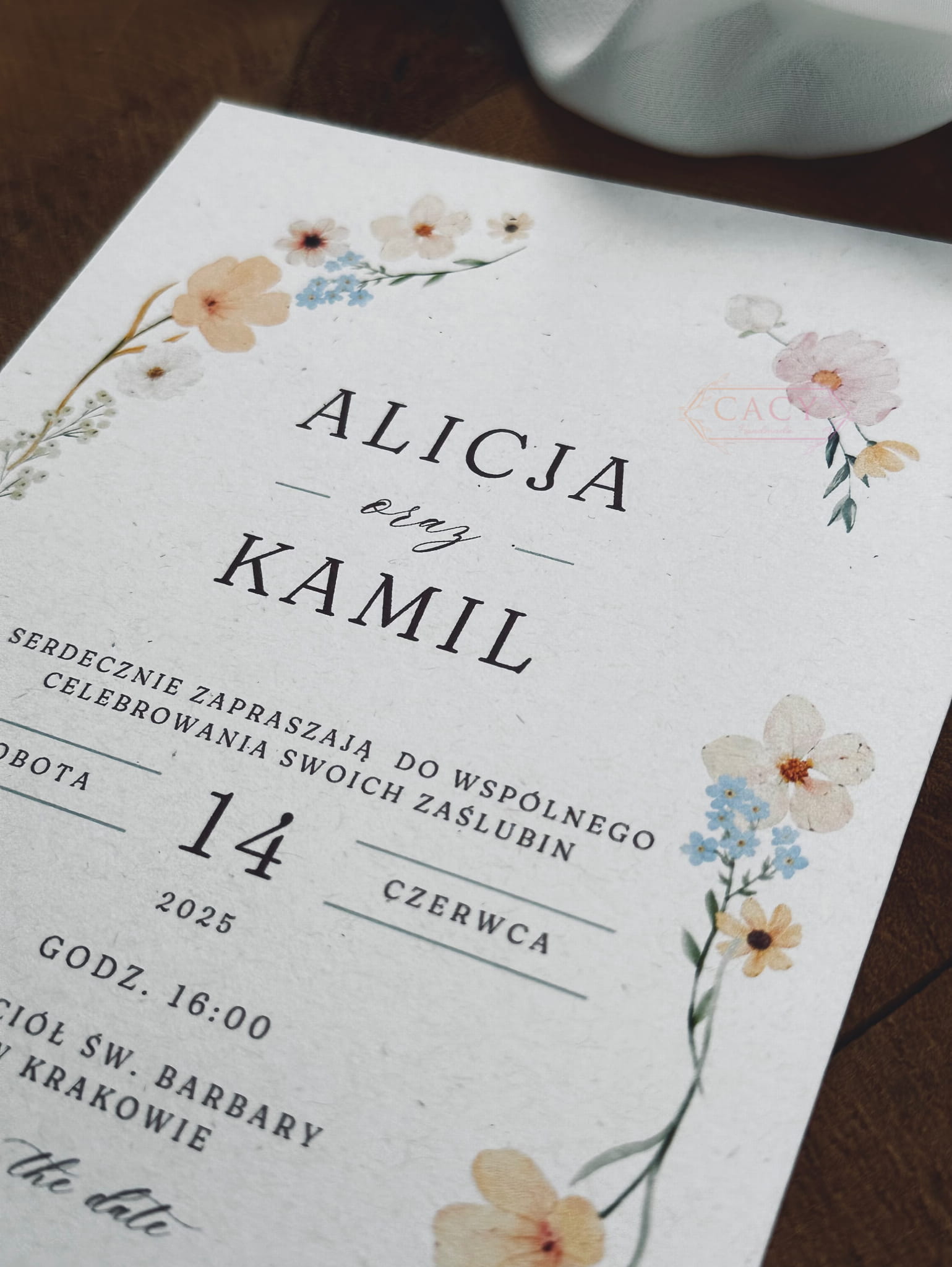 Treść zaproszenia utrzymana jest w ciepłym, brązowym kolorze, dzięki czemu całość prezentuje się bardzo delikatnie i elegancko. Stonowana typografia podkreśla kwiatowy motyw, nie dominując nad kompozycją graficzną.